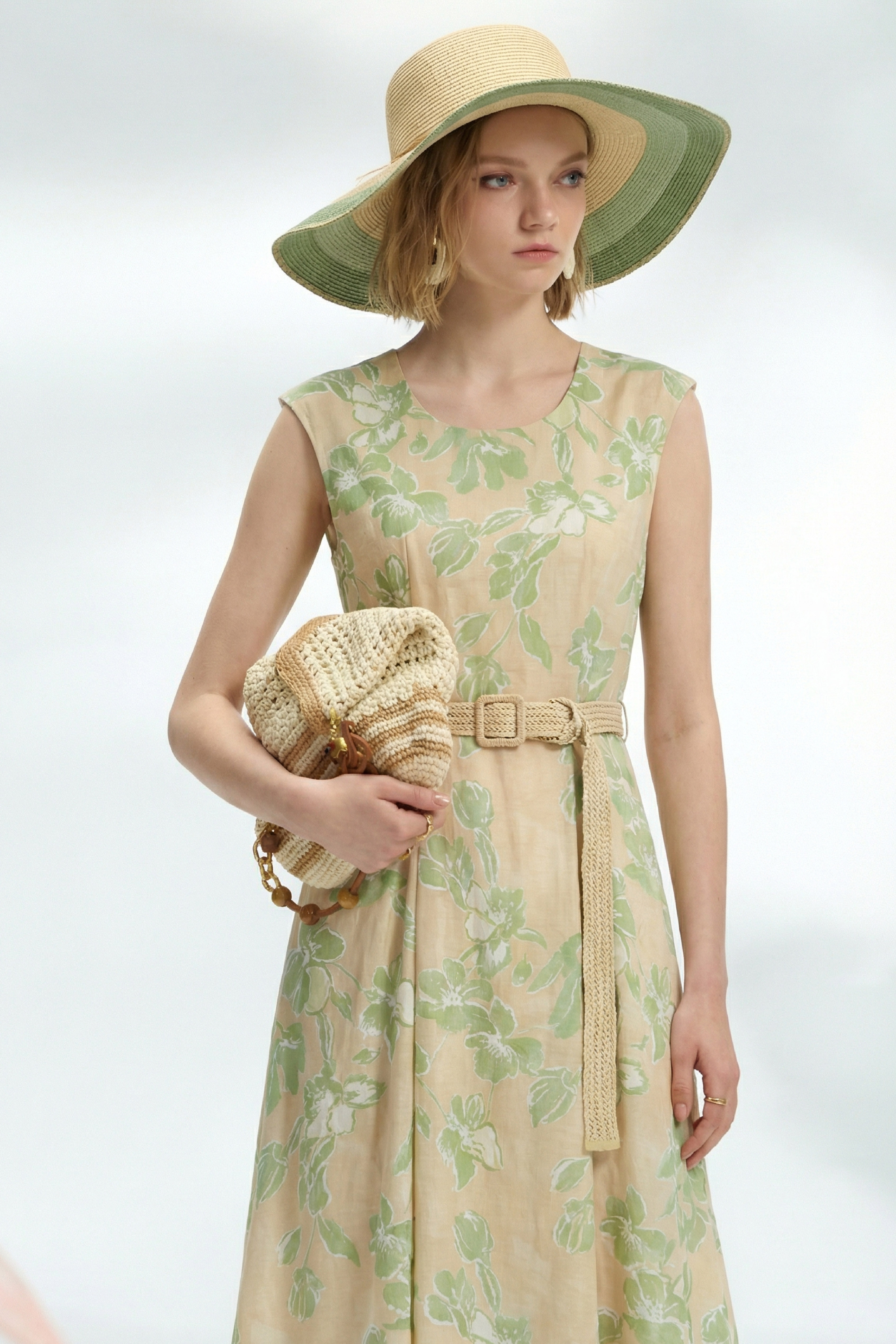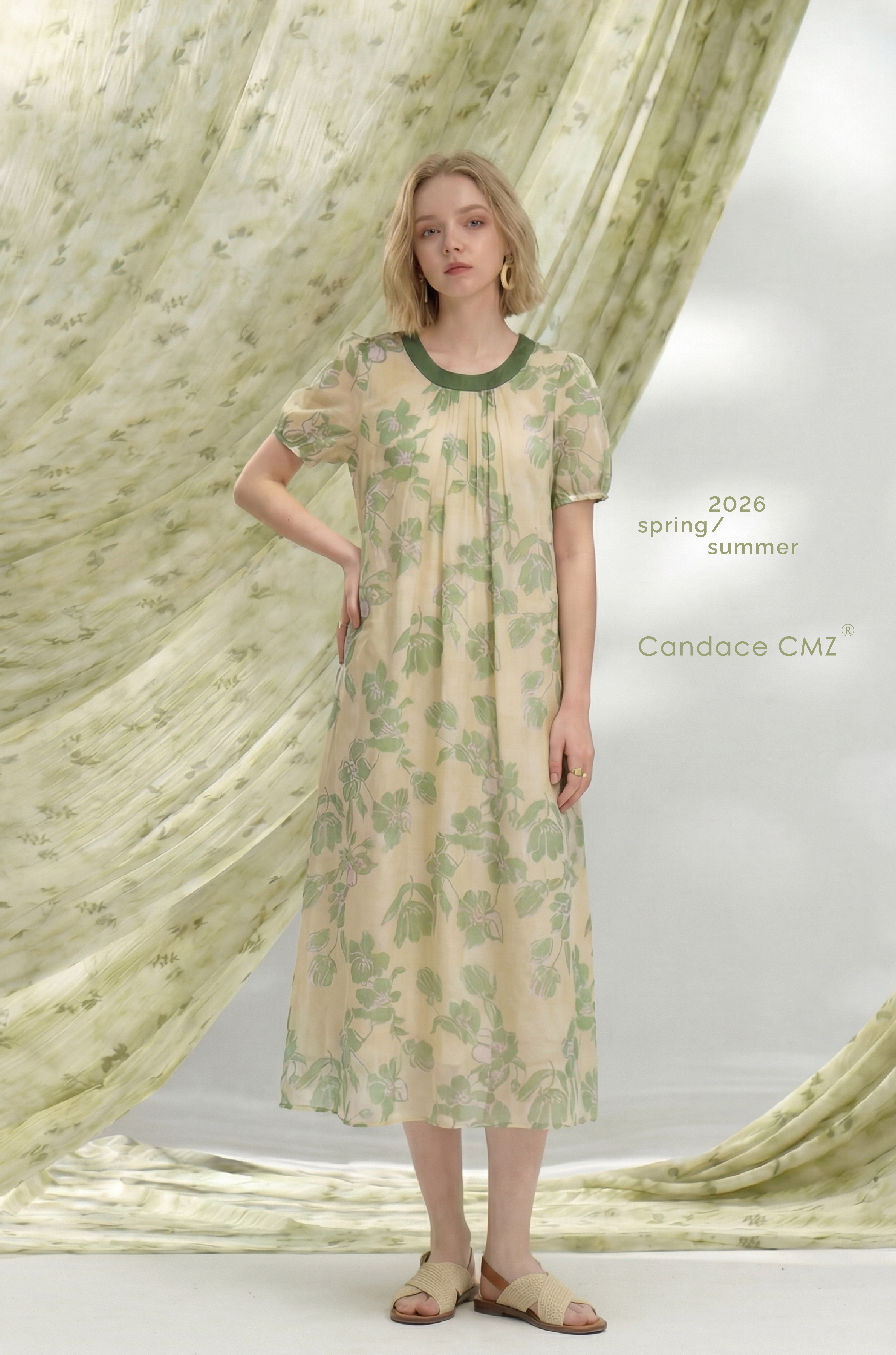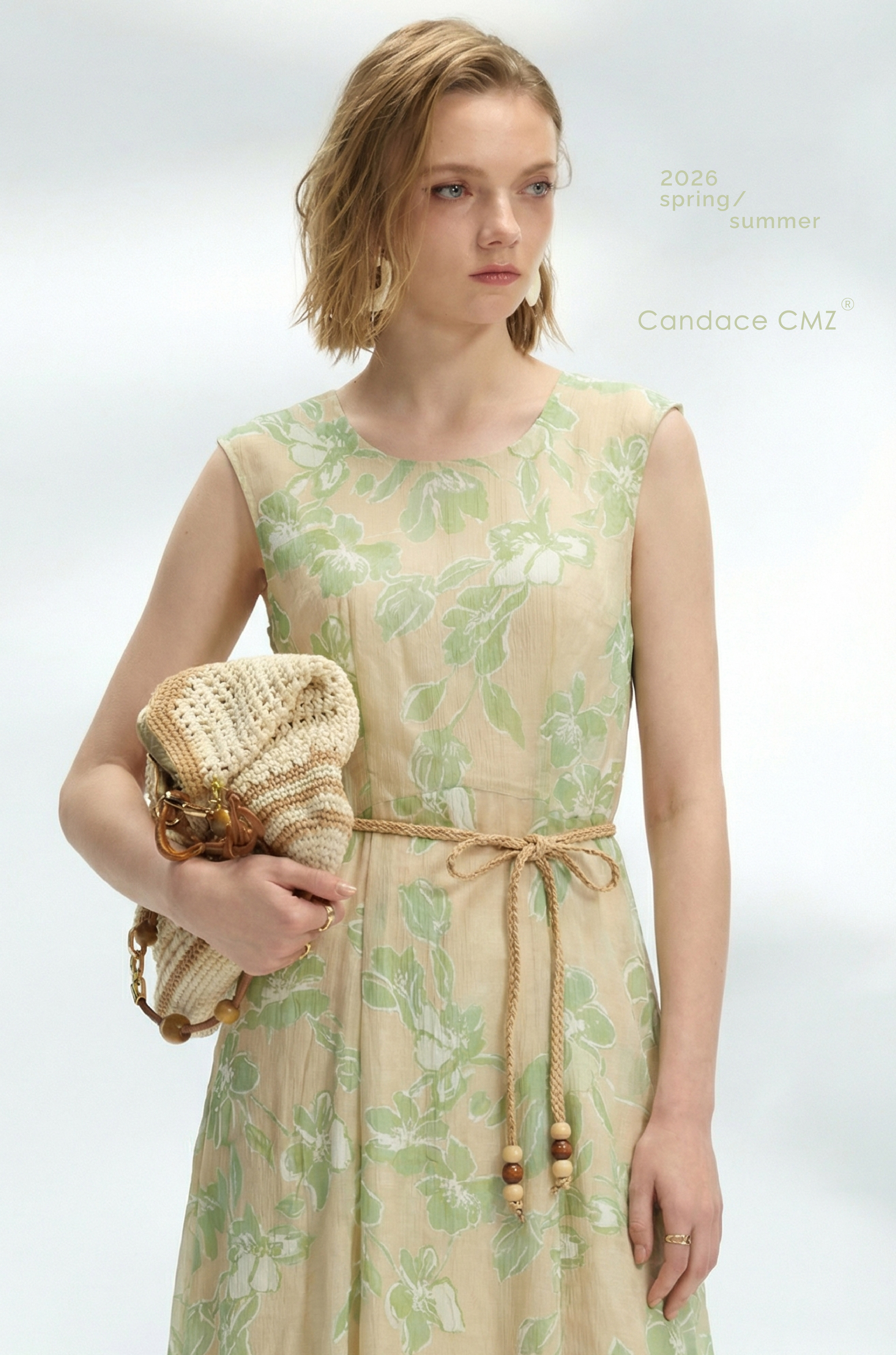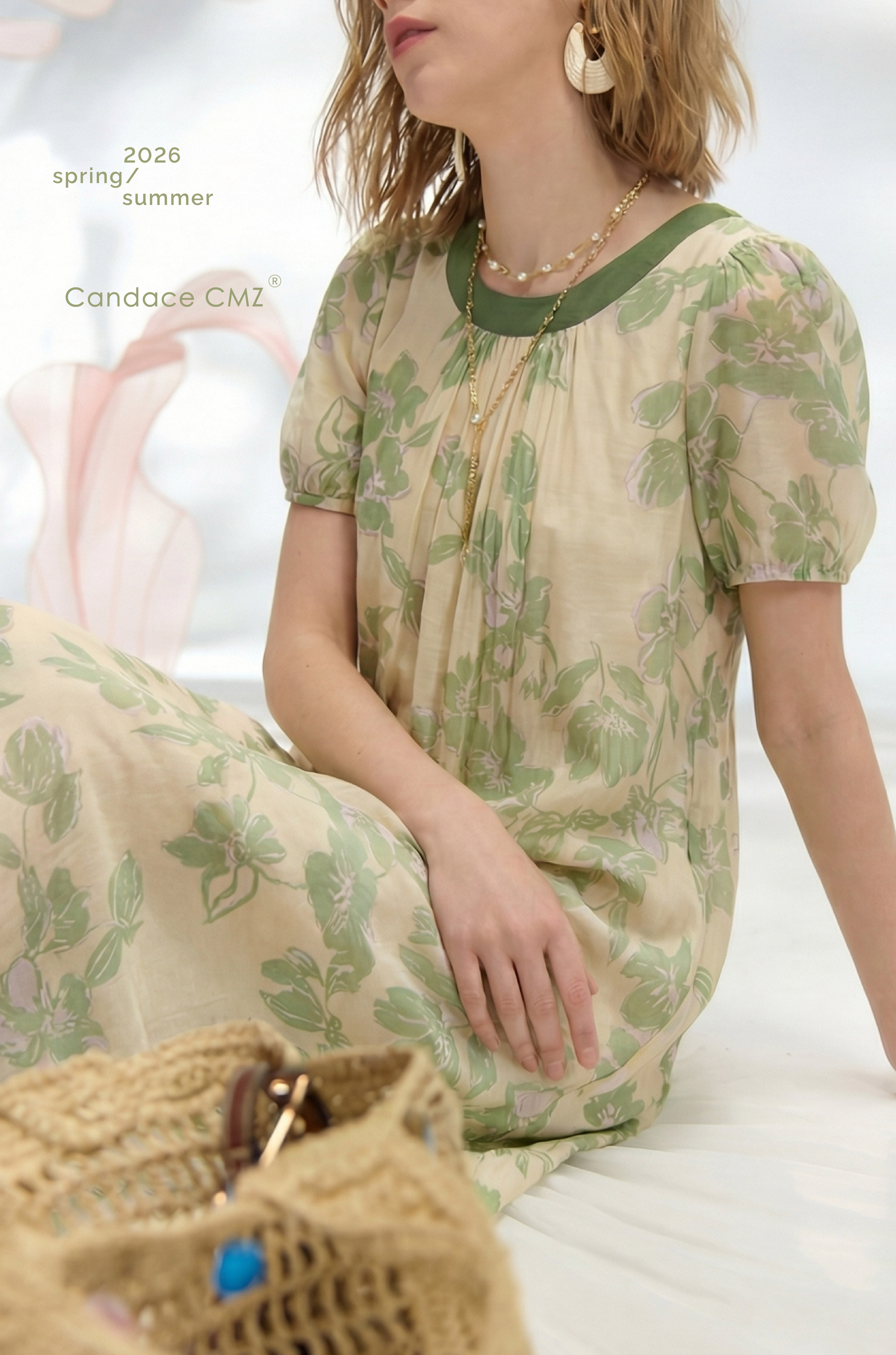 以淺淡柔和的綠色印花鋪陳衣身